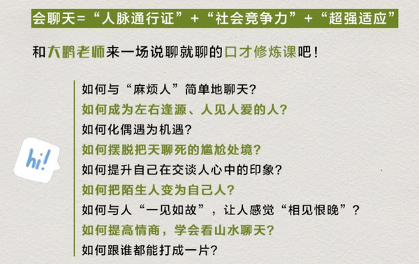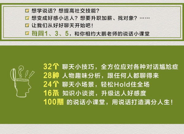 不管你是什么样的人,都能在大鹏老师的小课堂上找到适合你的提升方法。不管你的问题是性格内向,还是长相严肃,又或者是没有幽默感……这些疑难杂症大鹏老师都能治。和人聊天这件事,在大鹏老师这里从来都没有绝症,让我们从好好聊天开始。