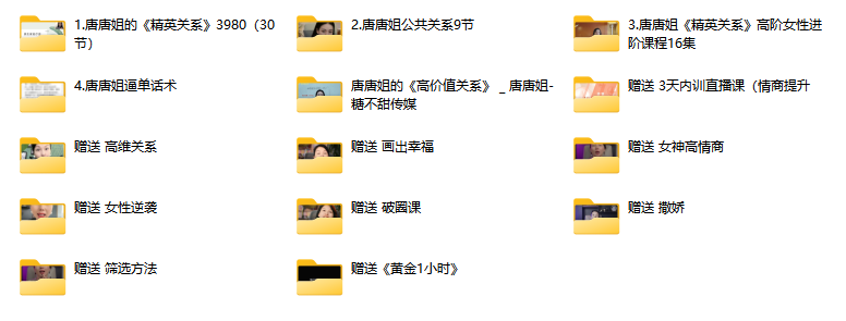 唐唐姐全部课程合集40G资源打包下载: 下载地址: 已获得查看权限 链接:https://pan.baidu.com/s/1Cn7WP1Pw6kbEmTVmXn5X7Q?pwd=eeht 提取码:eeht 解压密码:o{$yXSd(V%Cb6/kaGQ 切记!一定要下载下来以后再解压查看 声明:免责声明:本站资源均为网络平台购买所得,如有侵权,请及时联系客服删除,本站不承担任何责任!