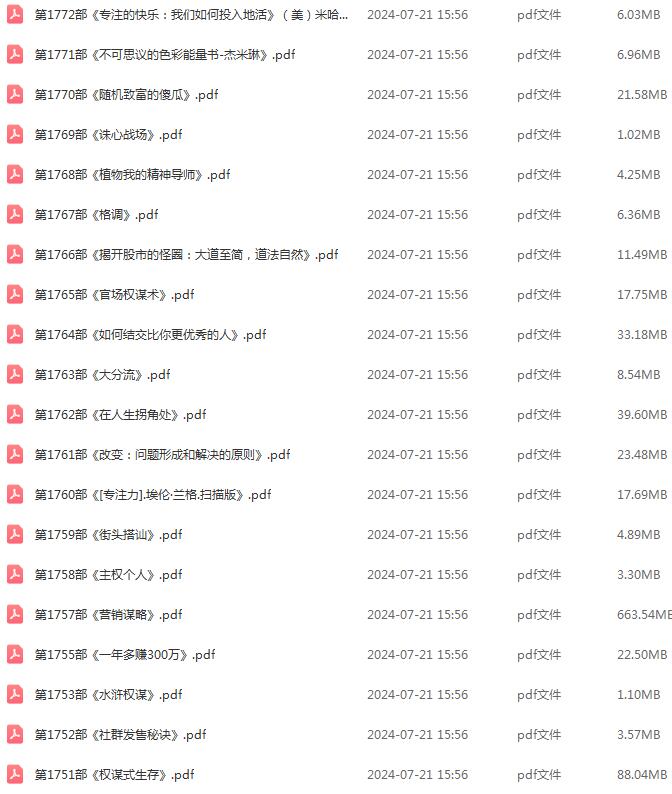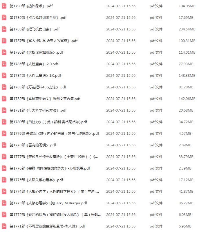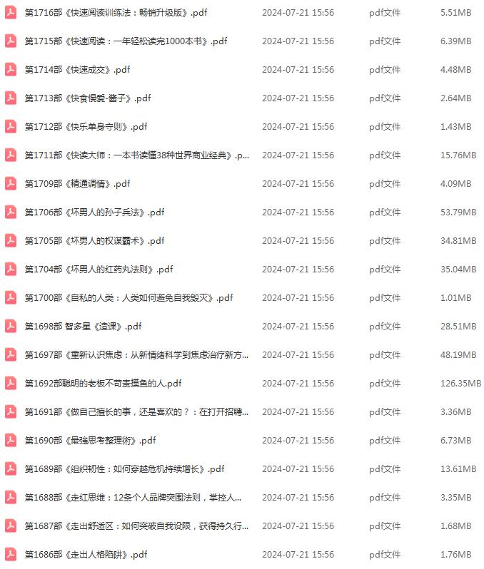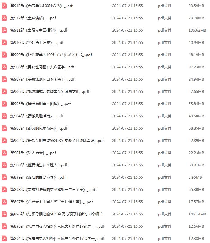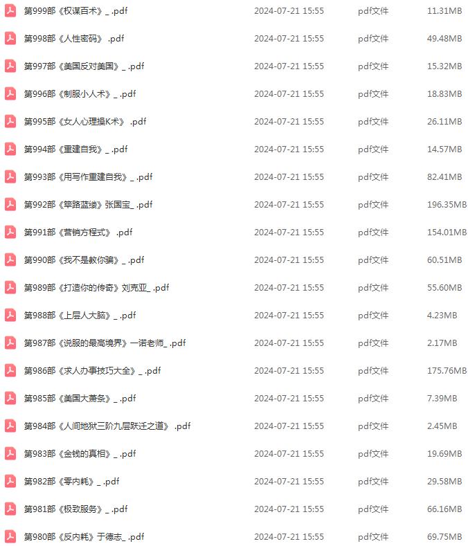 武林高手因为学了武林秘籍才能成为高手,我们普通人同样也需要这种能让我们出人头地的绝学秘籍,多年来我们通过各种渠道、人脉整理了一套只有少数人才能接触到的绝密资源,这套绝密资源总共有2500部电子版,包括人性、成长、恋爱情感、家庭、事业、财富、各种生活、人性技巧、各种突发避险等等,以下仅展示部分资源截图: