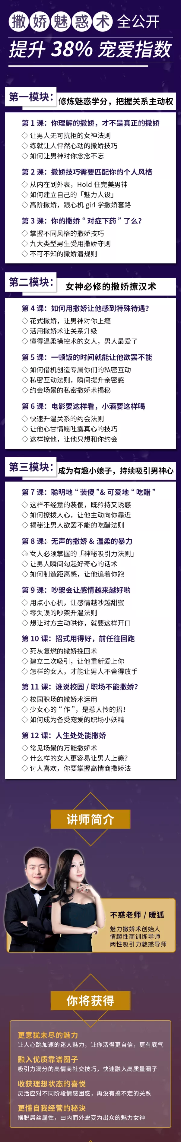 Last Updated on 2025年12月16日 by 两性学苑 《撒娇魅惑术全公开 提升38%宠爱指数》完整版课程下载: 下载地址: 隐藏内容 本内容需权限查看 购买查看权限 普通用户: 9.9元VIP会员: 免费永久会员: 免费 已有1000人解锁查看 声明:免责声明:本站资源均为网络平台购买所得,如有侵权,请及时联系客服删除,本站不承担任何责任!