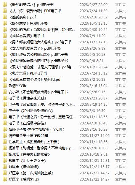 30套经典情感类电子书珍藏资源合集下载,以下仅展示部分资源截图: 30套经典情感类电子书珍藏资源合集下载: 下载地址: 已获得查看权限 链接:https://pan.baidu.com/s/1Svrq3GsQsLGj7YiIkFbioQ 提取码:3aqy 解压密码:kmdaka@#365@kmdh365 切记!一定要下载下来以后再解压查看 声明:免责声明:本站资源均为网络平台购买所得,如有侵权,请及时联系客服删除,本站不承担任何责任!